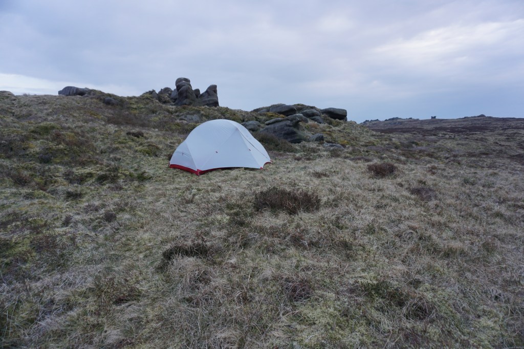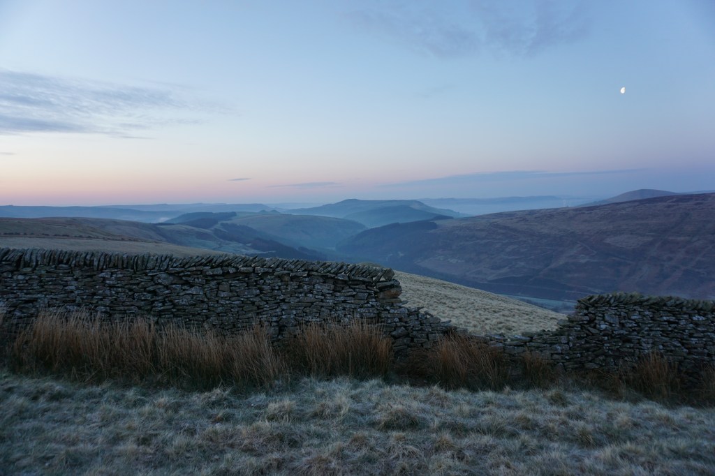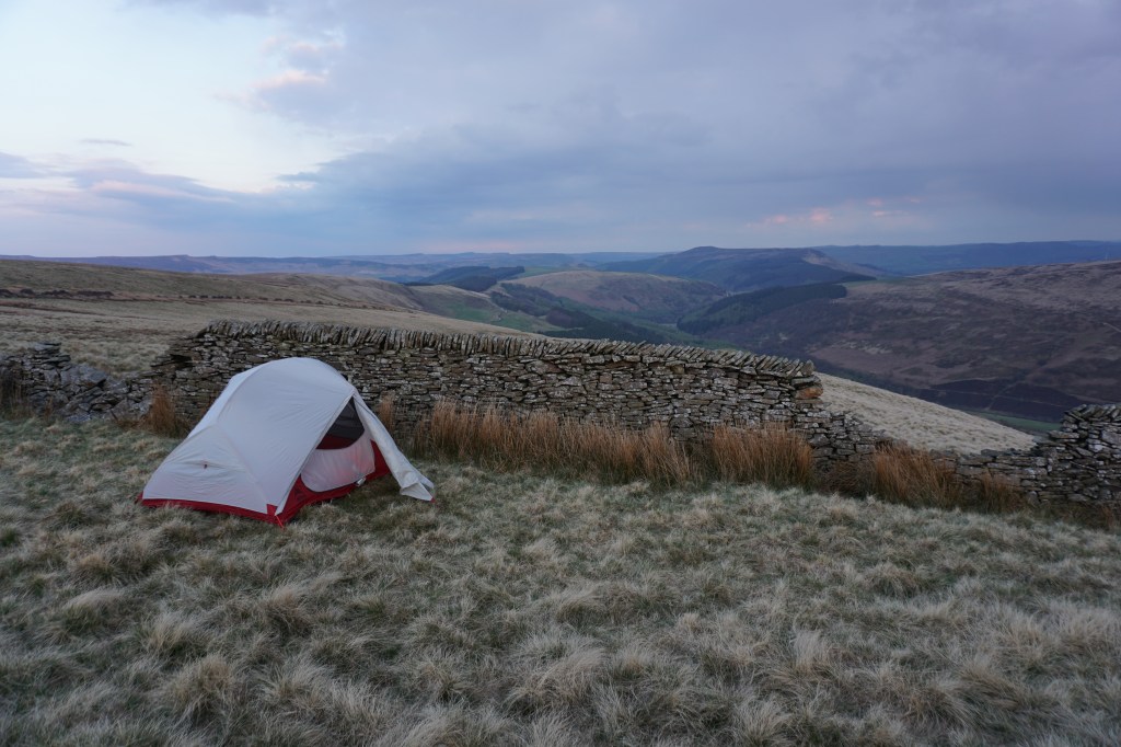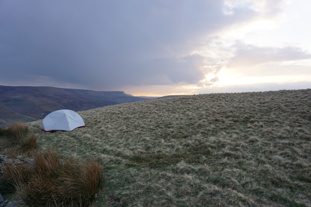 Day 2 (20.5km) started beautifully with clear skies and a beautiful sunrise. The night had been very cold as my tent was covered in frost. After having coffee and porridge, I continued along the ridge of Rowlee Pasture, after which I descended into the lush valley of Alport Farm. Following a dirt track with views over the valley and Snake Road the route continues over a footpath slightly ascending ad through beautiful meadows and pastures. After a descend to Snake Road, unfortunately the Snake Inn located there appears permanently closed, I followed the River Ashop until Fair Brook. Here, a steep climb along Fair Brook led me to Kinder Scout plateau. At the top I turned tight to follow the edge with wide views to walk all around the plateau to Kinder Downfall, which was not even as much as a trickle of water. A more difficult to navigate route crossing the plateau over moorland I reached the other side of the plateau at the rock formation of Crowden Tower. I made camp just beyond this point around Wool Packs (see star on map below).