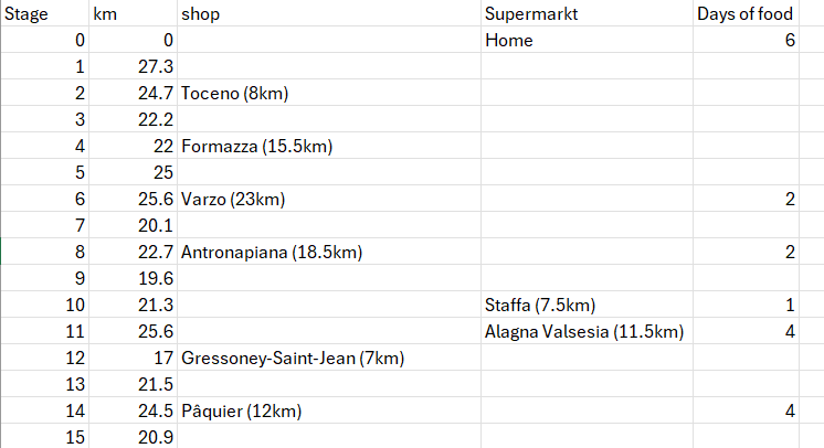 I am not sure I can complete this section in 45 days and not all sections finish in a logical place, but these sections are only a guideline. Without a guidebook relating infrastructure on the trail, the most important thing to figure out is where I can get groceries. Using Komoot and Google Maps, I went over all the 45 sections in detail to locate all the grocery shops I would encounter and created an Excel file to take not of them and calculate how many days of food I would need from a particular shop.